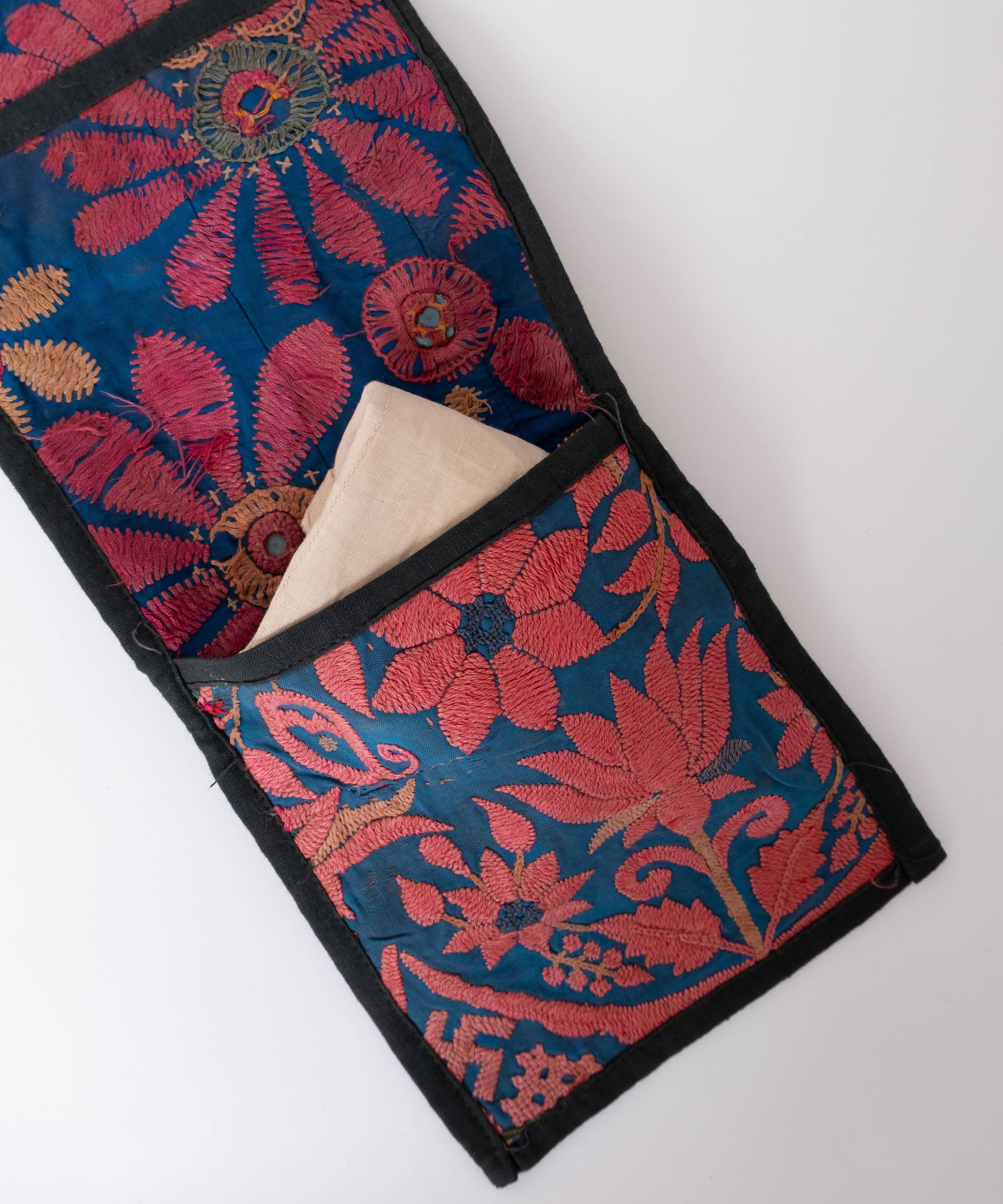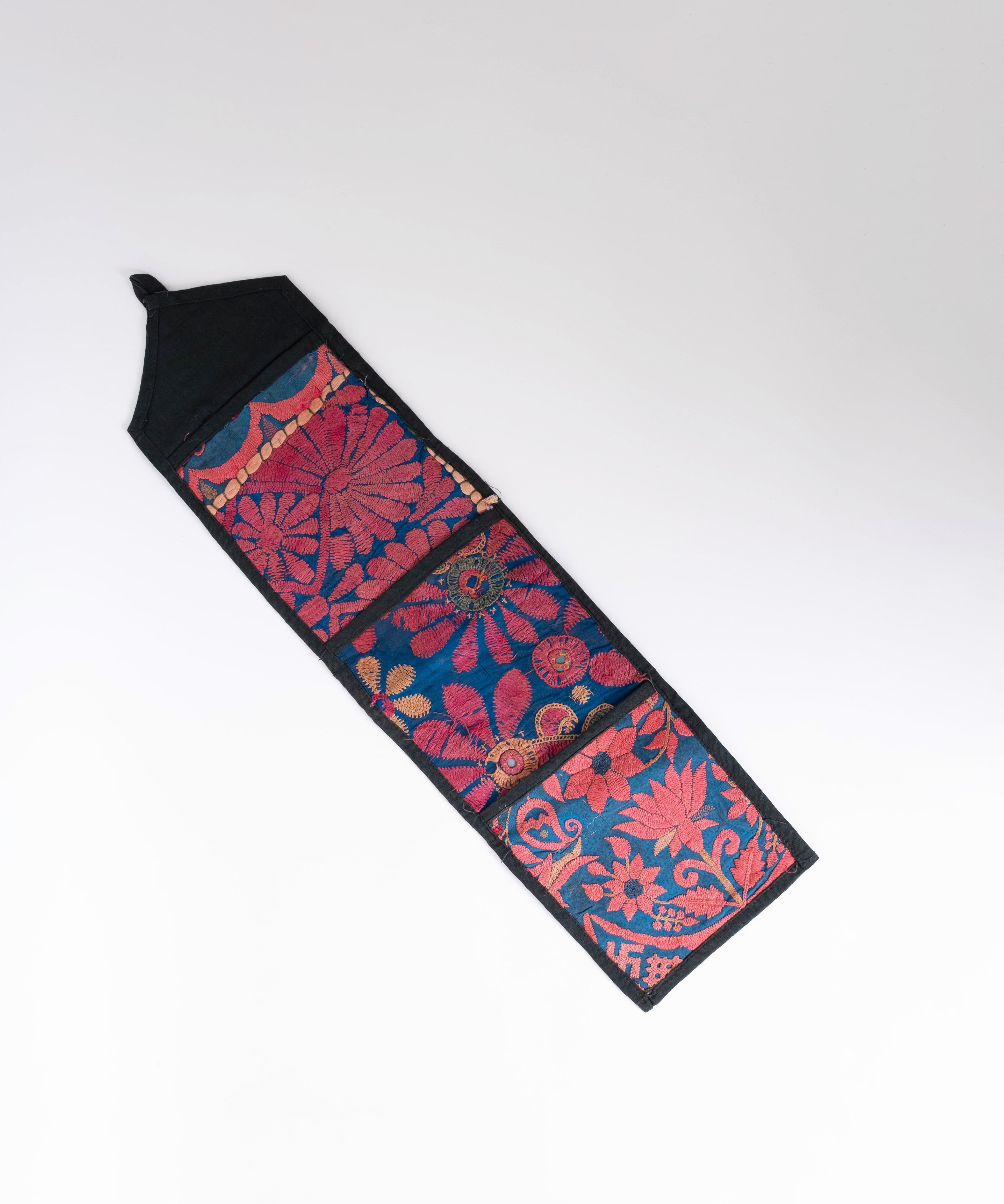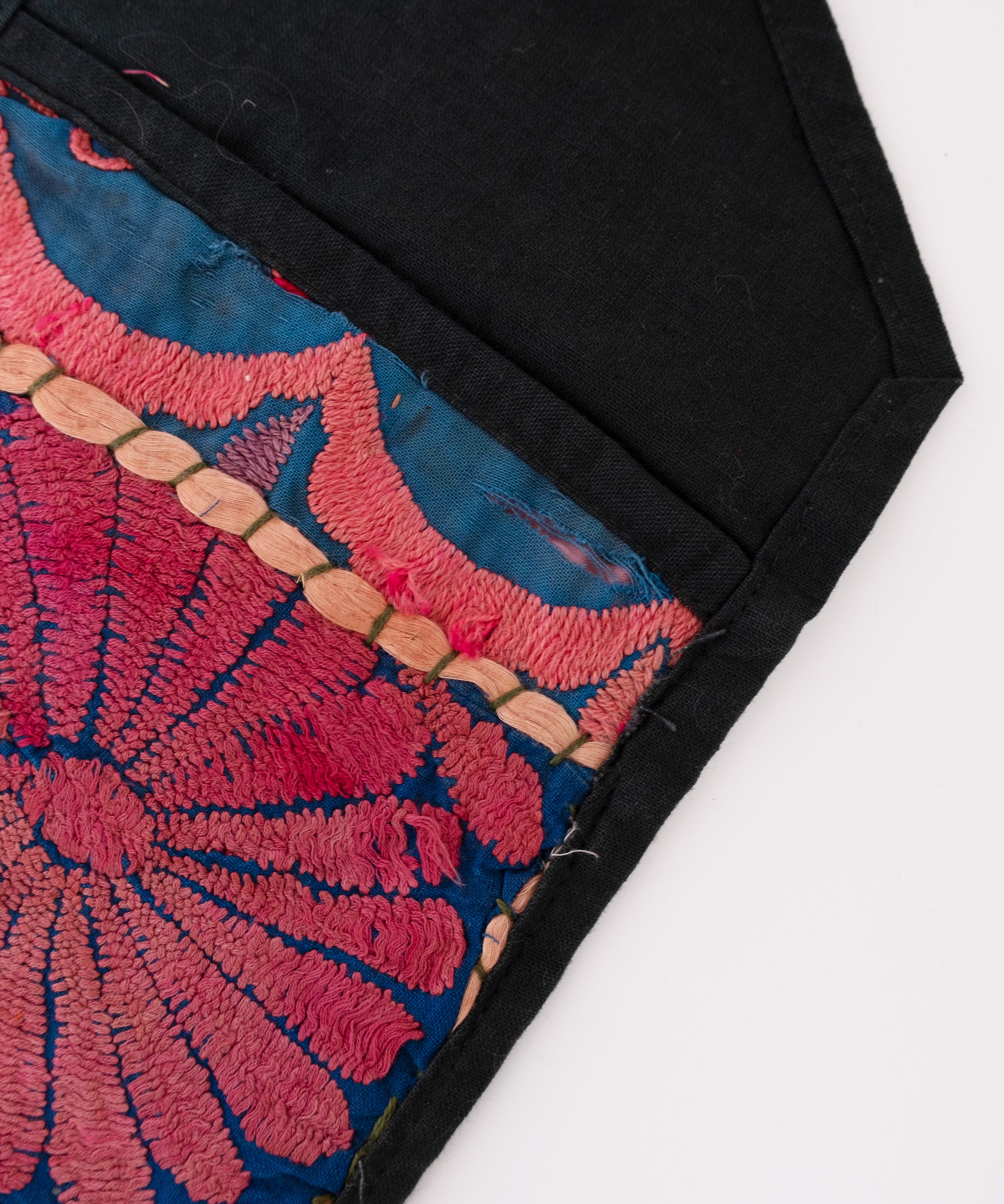 伝統的な手刺繍が施された、鮮やかな花柄が印象的なウォールデコレーション。もともとはお金などを入れるポーチとして使われていたもの。