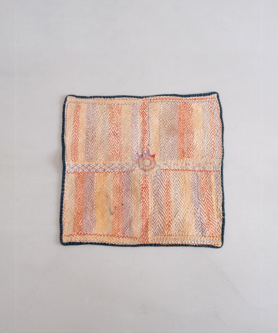 カンタとはインドやバングラディッシュのベンガル地方に伝わる刺し子刺繍のこと。古いサリーなどの布を何枚も重ね、刺し子ステッチを施し、丈夫な布として新たに蘇らせる技法です。