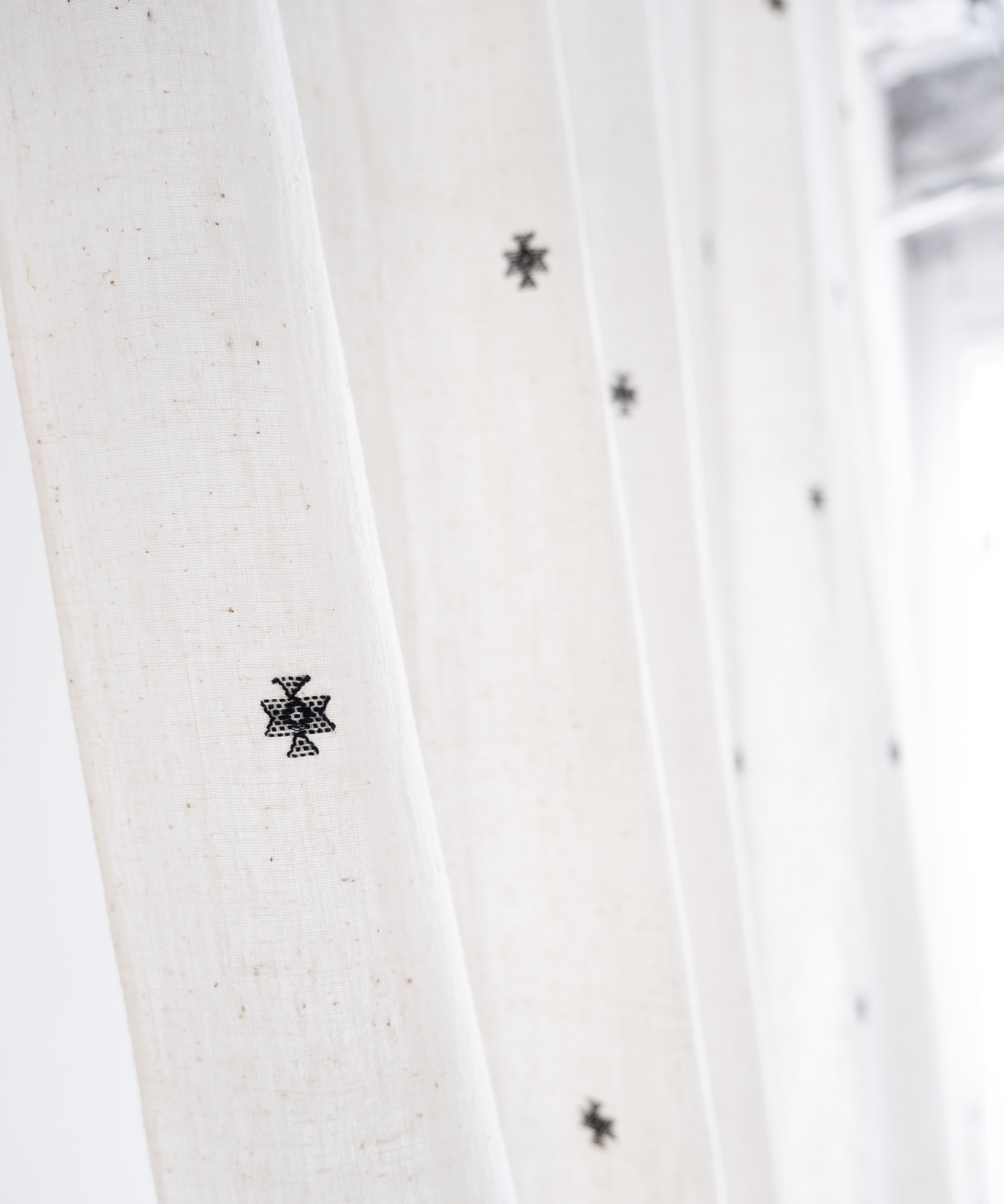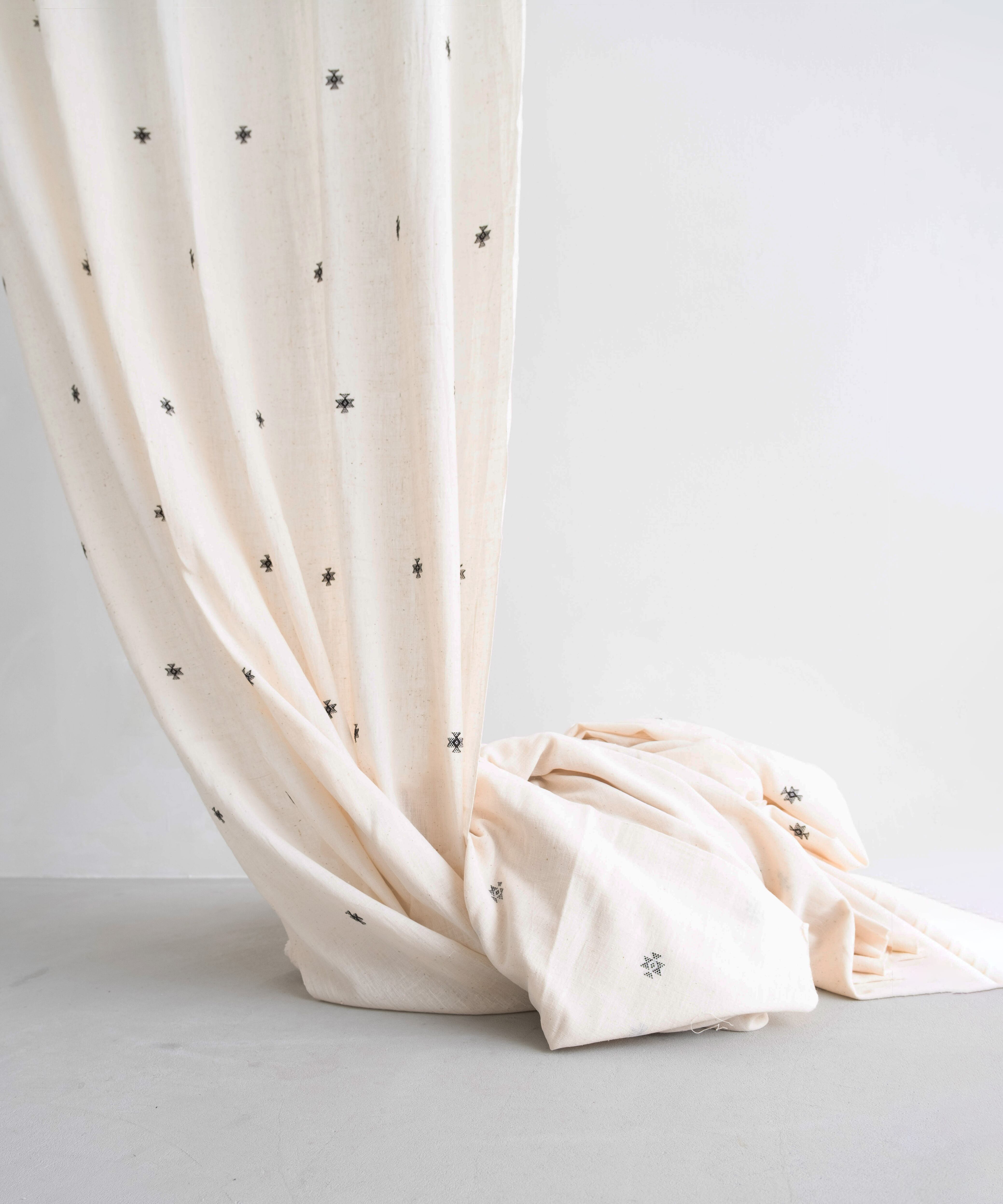 カッチ地方で育てられている、品種改良されていない原種の綿花「kala cotton(カラコットン)」を使用し、手織りで仕立てられた生地です。柄は、ヨコ糸を追加で織り込むことで表現されています。