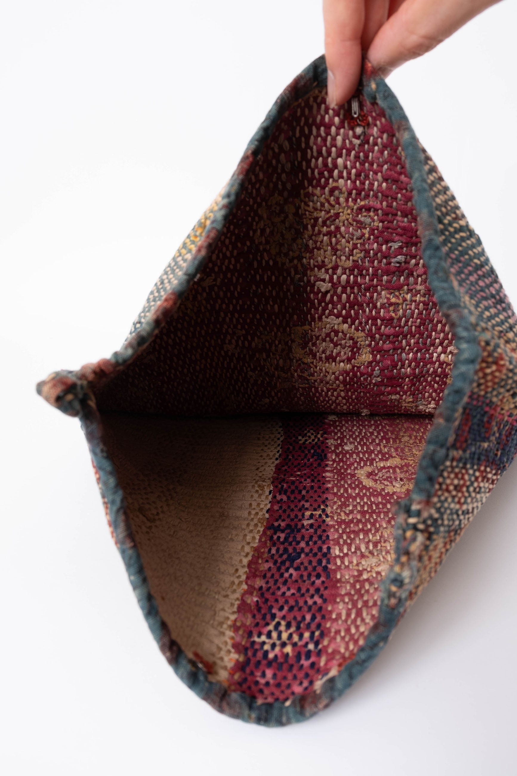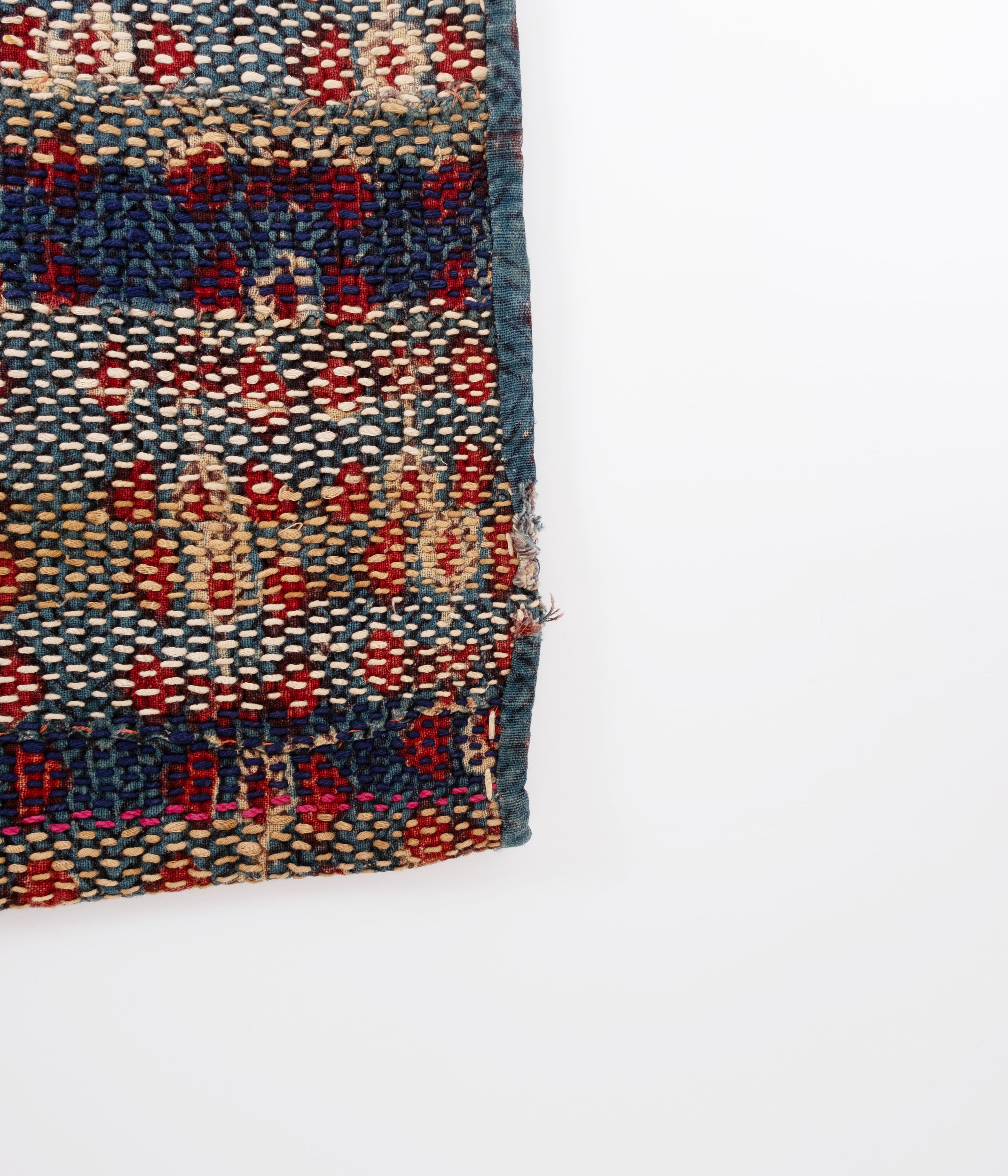 元々一辺が開くように縫製されており、内側にホックを取り付け閉じられる仕様です。模様の入り方やパッチワークされているところも一点一点異なり、それぞれの布の個性が魅力的。
