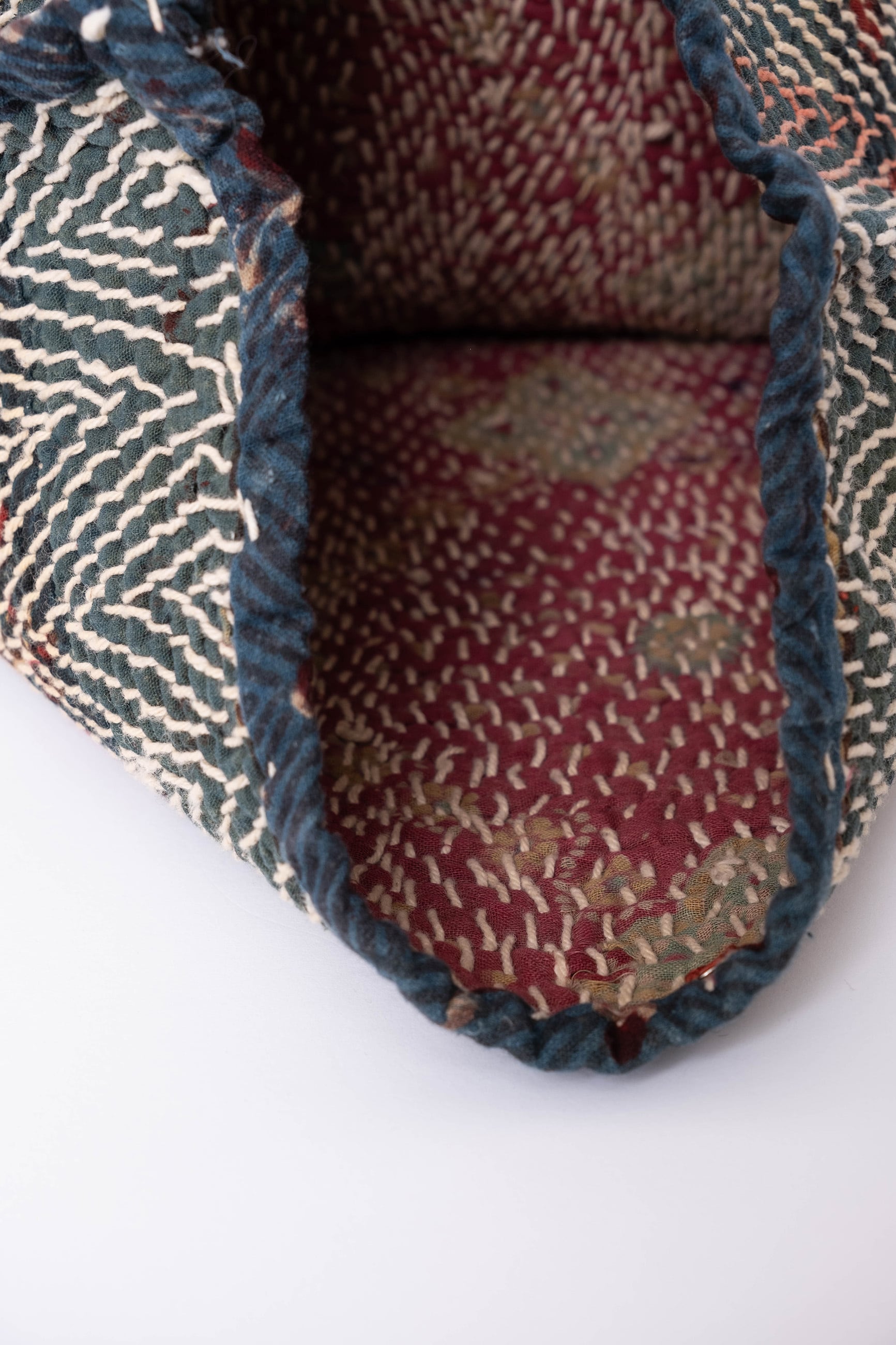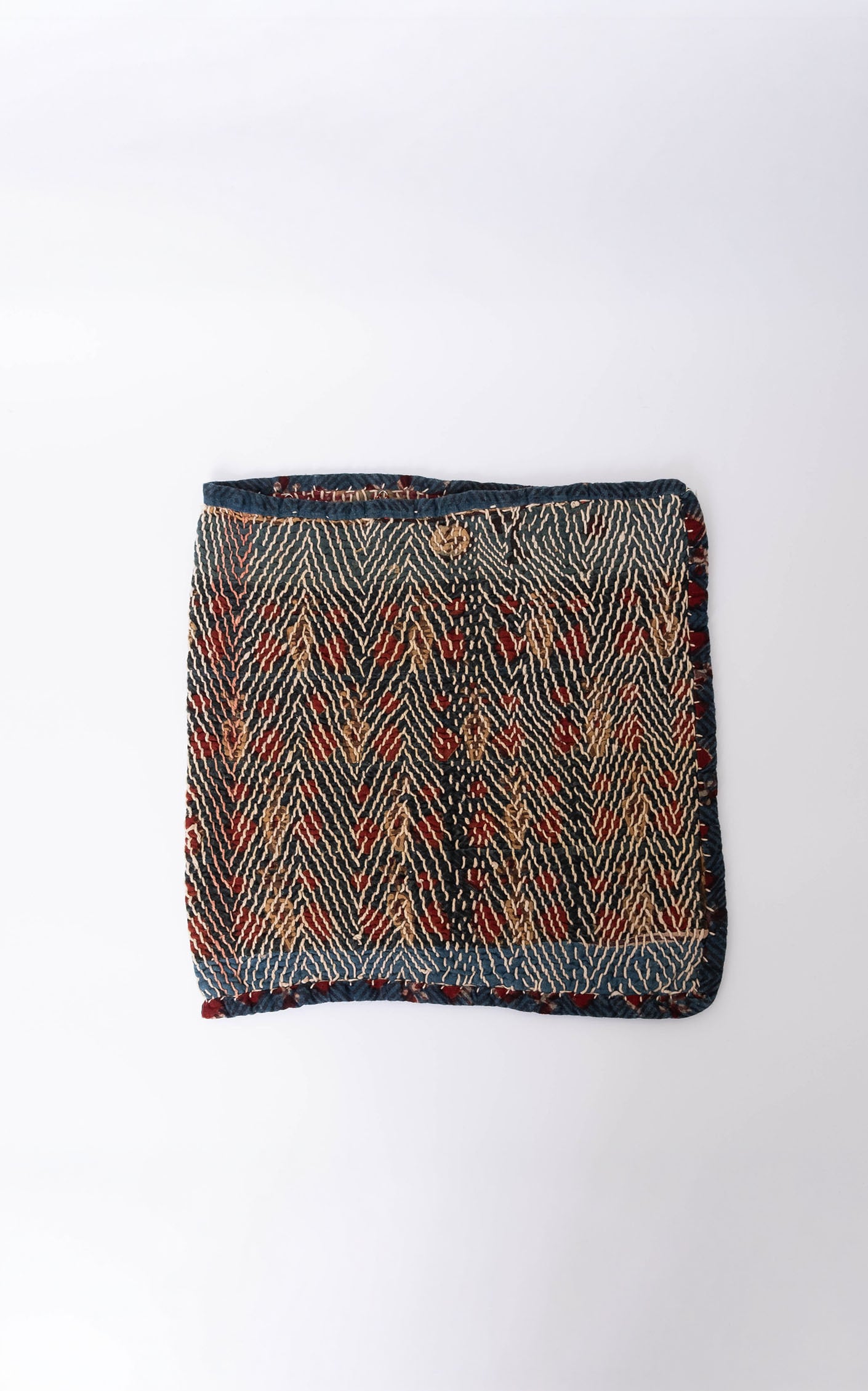 元々一辺が開くように縫製されており、内側にホックを取り付け閉じられる仕様です。模様の入り方やパッチワークされているところも一点一点異なり、それぞれの布の個性が魅力的。