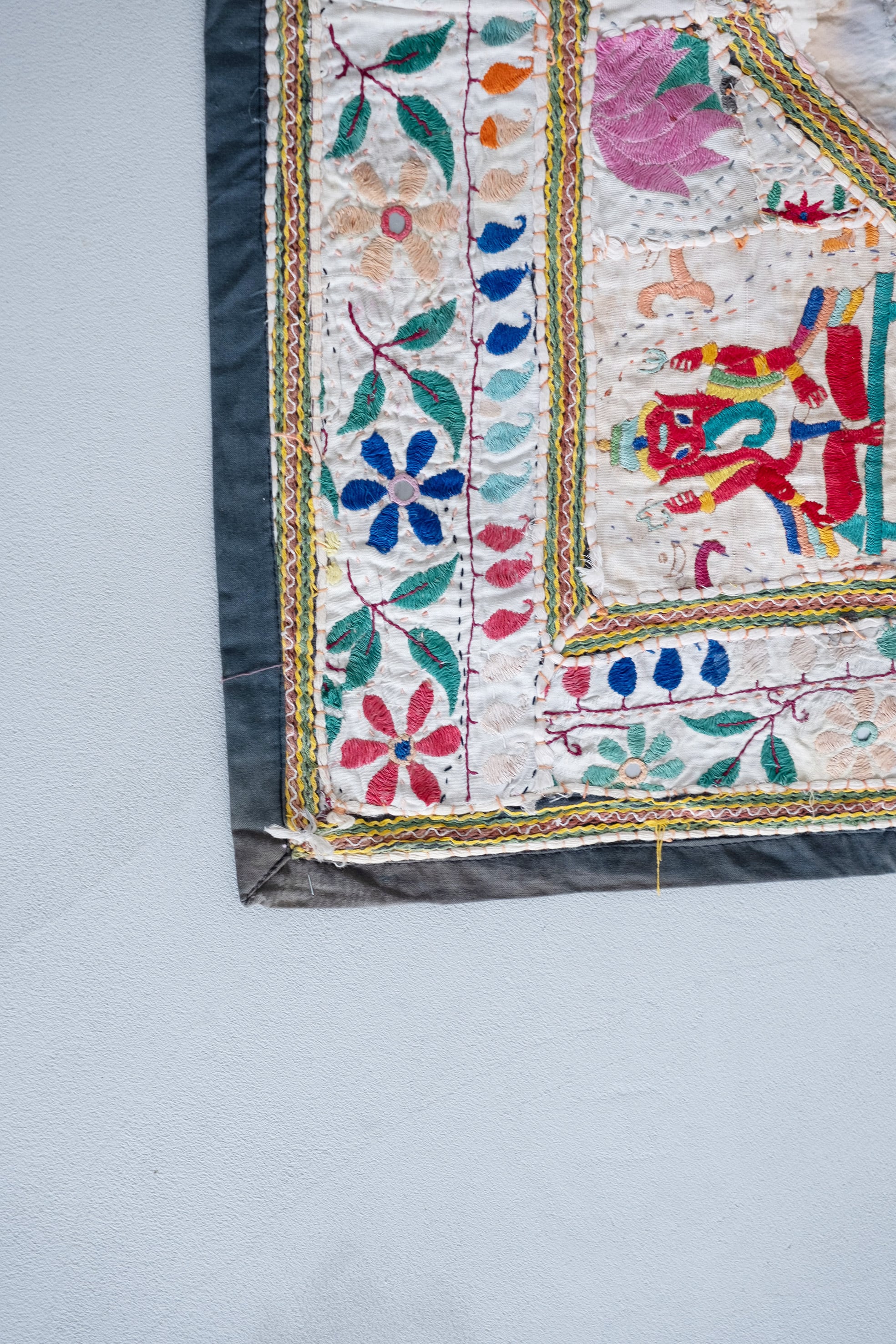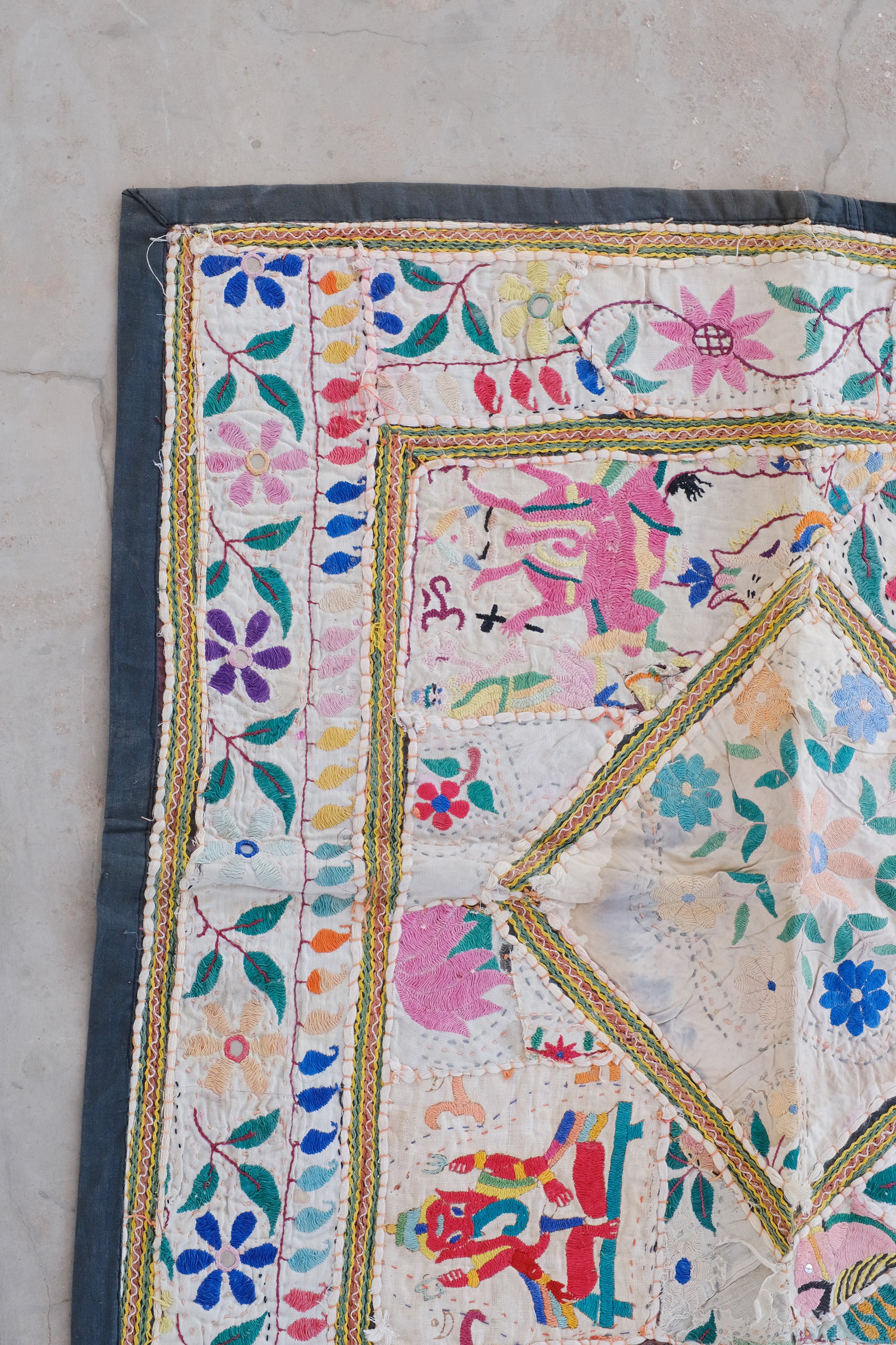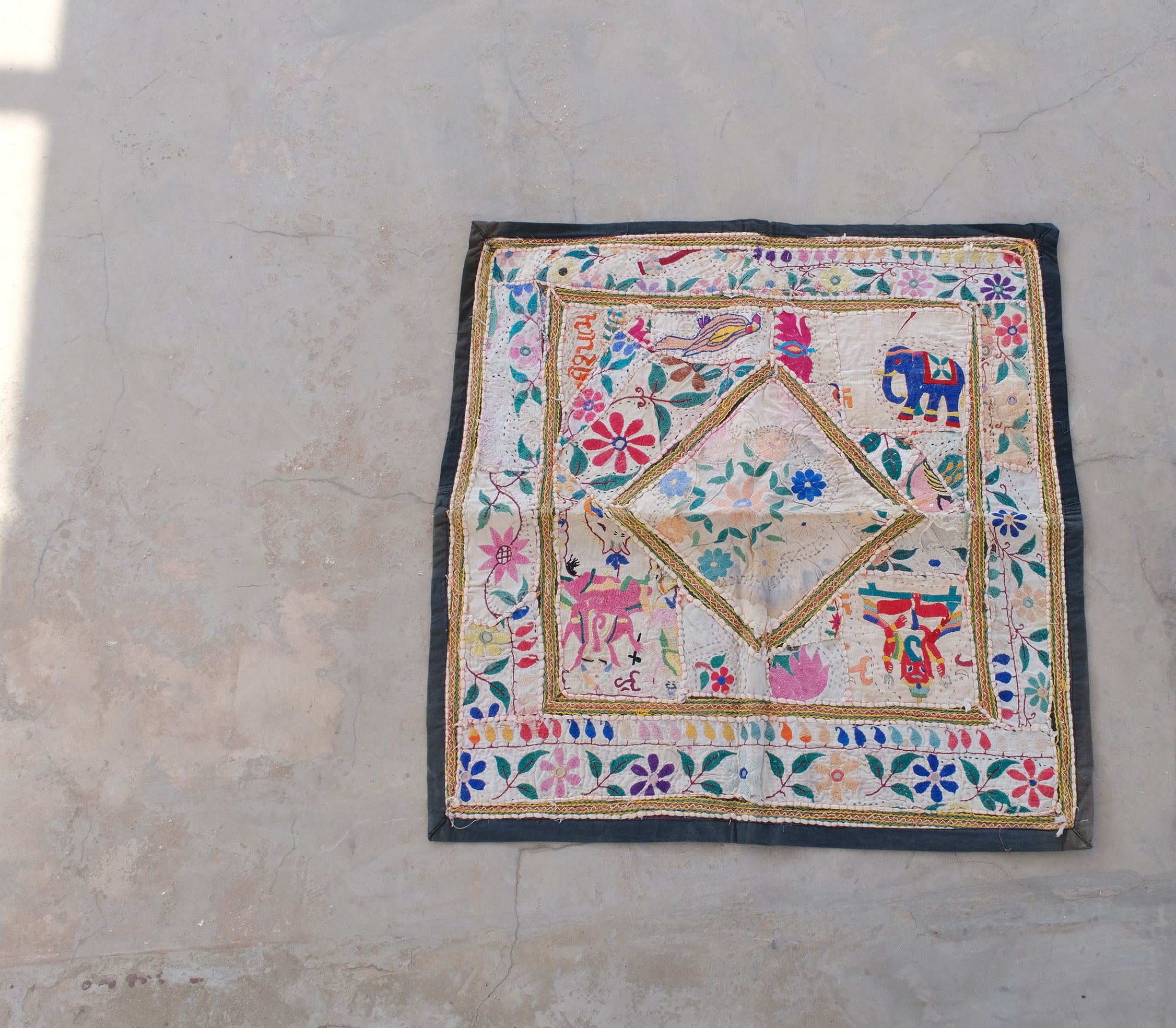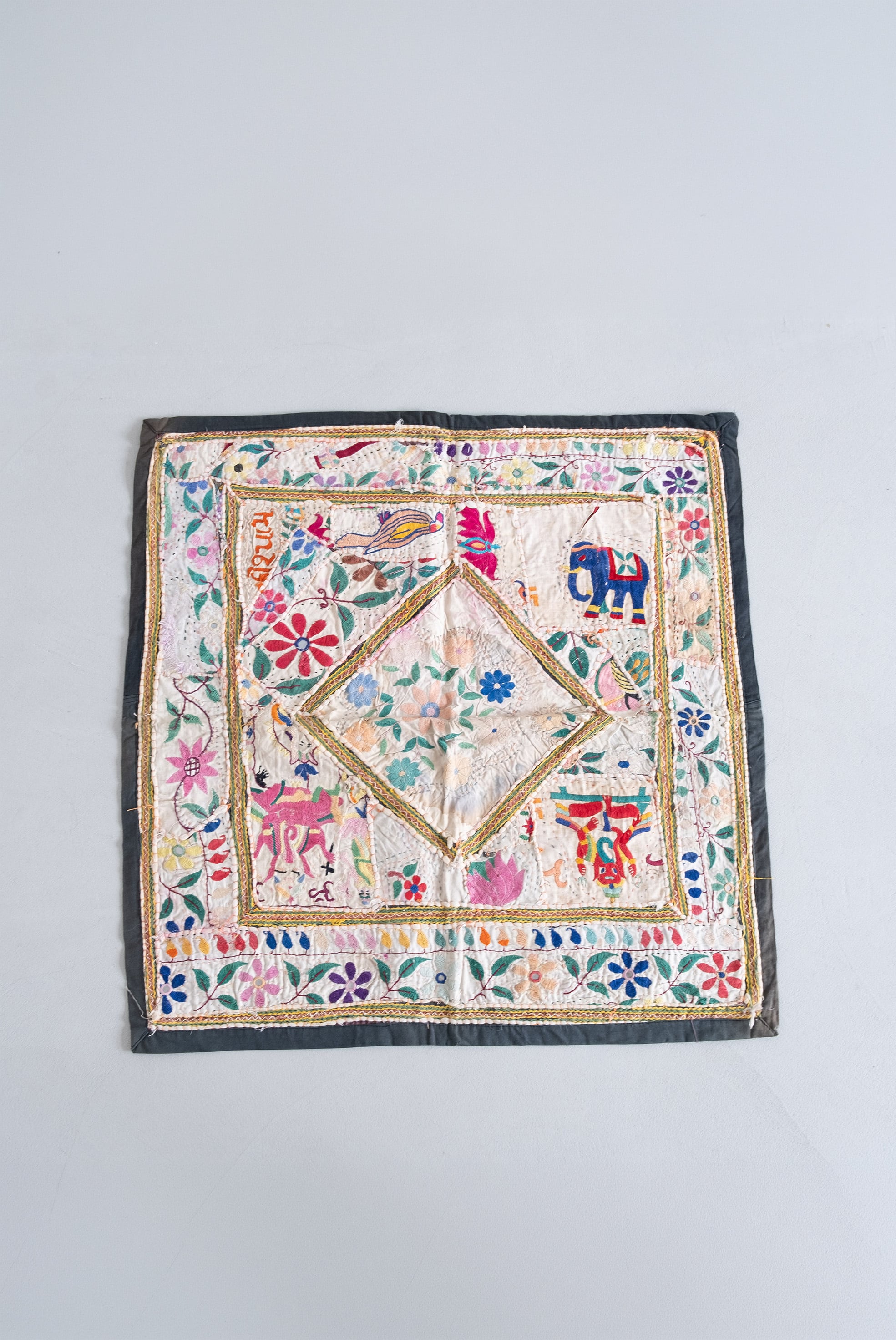 古い刺繍布を丁寧に繋ぎ合わせたパッチワークには、ガネーシャ、鳥、ゾウ、ヒンドゥー語のモチーフなど、多様な意匠が組み合わされています。愛らしさの中に、土地の記憶や時間の重なりが感じられる一枚です。
